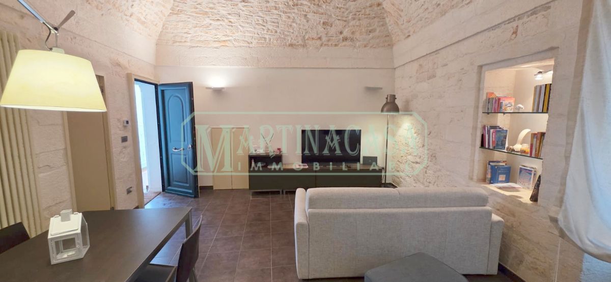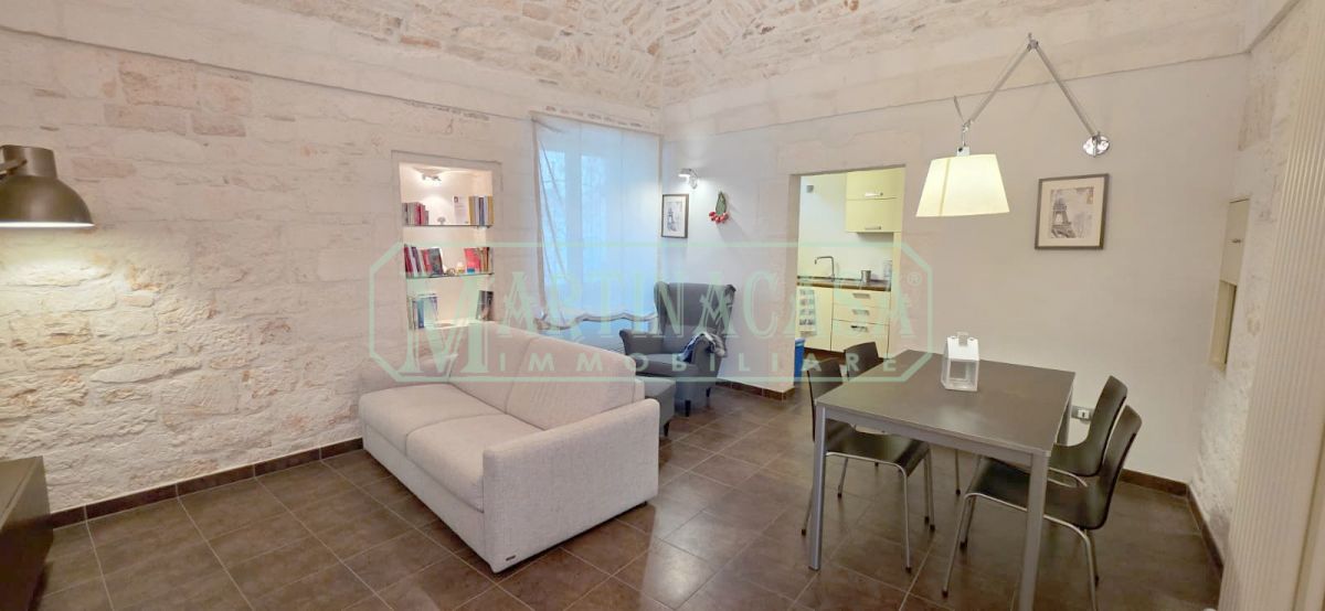 In un caratteristico scorcio del Centro Storico di Martina Franca, appartamento indipendente finemente ristrutturato disposto su due livelli. L'abitazione principale si sviluppa al primo piano e comprende soggiorno-pranzo, bagno con doccia, cucinino, piccolo disimpegno dal quale parte la scala di accesso al soppalco con posto letto singolo ed infine camera matrimoniale. Tutti gli ambienti possiedono tipiche volte in pietra. Il piano terra è costituito da un unico vano sempre con alcuni dettagli in pietra viva. L'immobile, molto confortevole e dotato di riscaldamento autonomo ed aria condizionata, viene venduto completo di arredi, molti dei quali realizzati su misura.